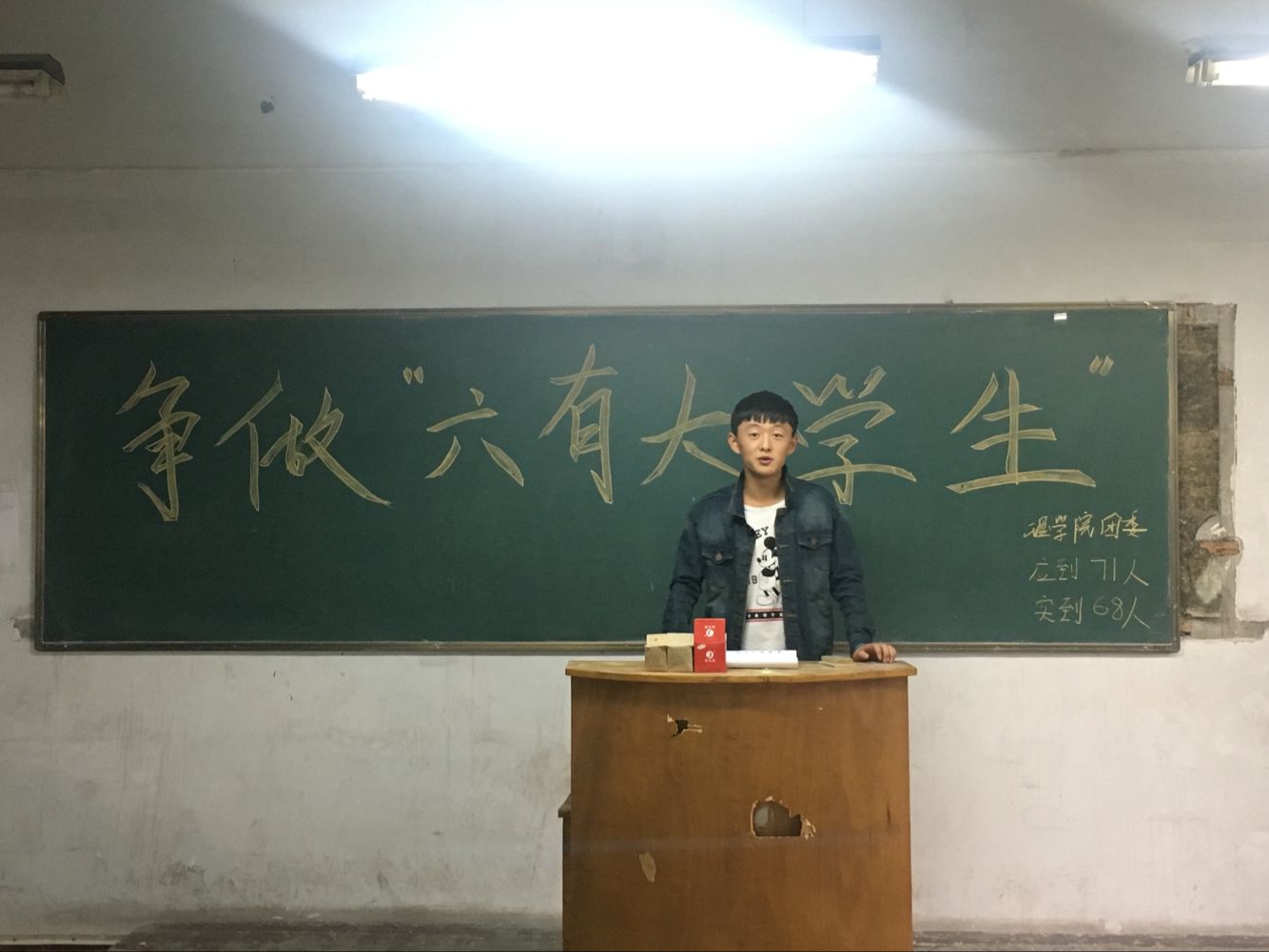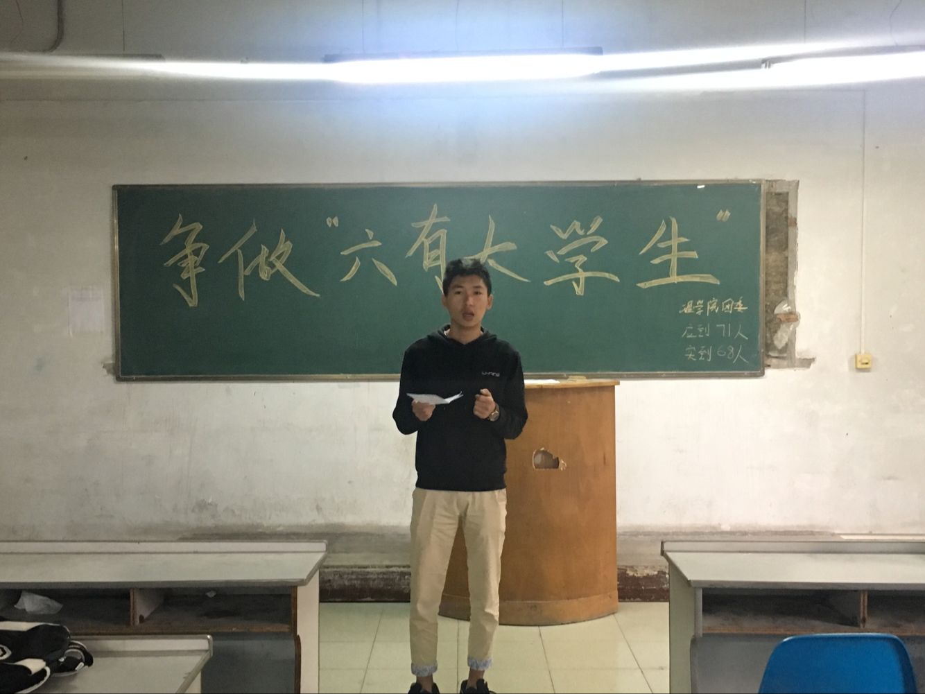 为响应习近平总书记的号召,加强学生管理,beat365在线唯一官网在10月12日下午4点在北207教室举行了争做“六有”大学生主题班会。班会由组织部部长寇帅佳主持,参会人员为团总支书记杨陈东以及全体大二学生。
