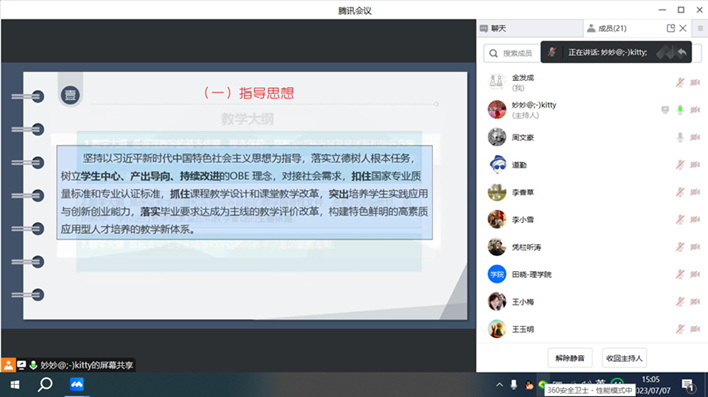为进一步提高人才培养质量,加强课程思政建设,beat365在线唯一官网物理教研室于2023年7月7日下午以线上会议方式,召开了2023版光电信息科学与工程专业教学大纲修订与编制研讨会。物理教研室全体成员参加了该会议,会议特邀了学院党总支书记胡红亮和丁琦副院长参加,金发成召集主持。