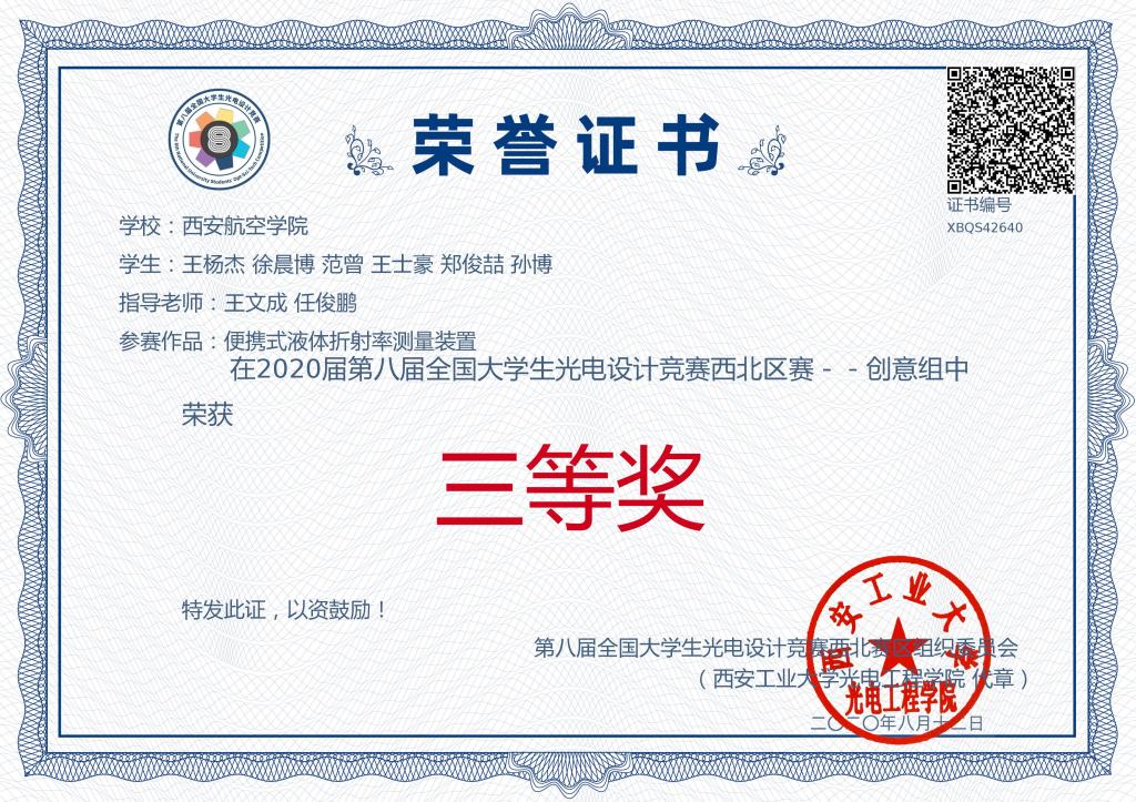 2020年8月10日,第八届全国大学生光电设计竞赛(西北赛区)在西安工业大学落下帷幕,共有来自西安交通大学、西北工业大学、西安电子科技大学、兰州理工大学、宁夏大学等西北五省16所高校的141支队伍报名参赛。beat365是首次参加该项全国性光电竞赛。经过线上评审初赛,共有57支参赛队伍获得路演决赛资格,beat365beat365在线唯一官网王文成、任俊鹏老师指导光电信息科学与工程专业6名本科生组成的“追梦”团队荣获西北赛区三等奖。