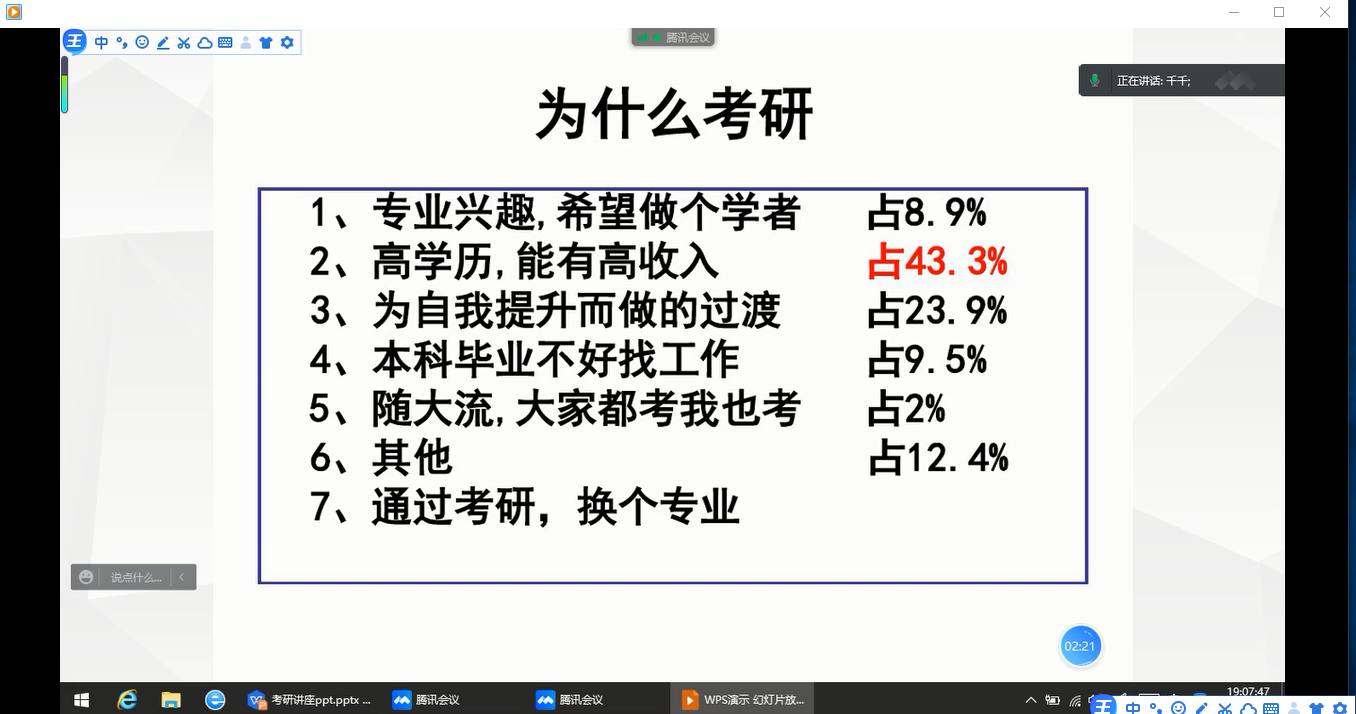 此次线上讲座的举办有利于使学生意识到考研的重要性与紧迫性,也让学生了解了本专业的现状,熟悉了考研经验和正确的考研方法,为学生以后的研究生考试打下基础。