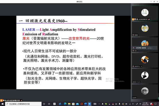 1月18日早上9点半,金发成老师给光电专业的学生做了“强激光场下原子分子性质”的学术报告。报告简要介绍了激光器的发展历程和激光在生活中的应用情况,原子分子在强激光场中常见的现象,特别详细地阐述了阈上电离和高次谐波这两种强场过程的研究现状。讲座的最后,金老师鼓励学生在疫情期间做好自己的本职工作,努力学好本专业知识,为强场物理领域做出一点贡献。