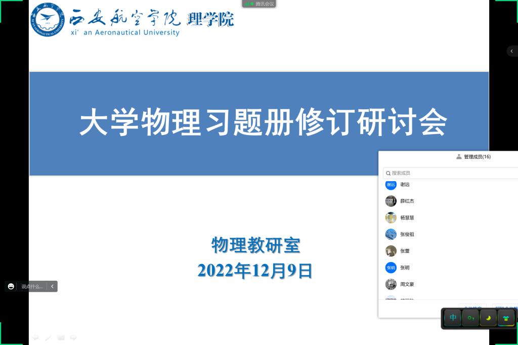 12月9日下午2点,beat365在线唯一官网物理教研室线上开展了“大学物理习题册修订”研讨会议。校级督导张俊祖、beat365在线唯一官网副院长丁琦和物理教研室全体教师参加了此次会议,会议由物理教研室主任王小梅主持。
