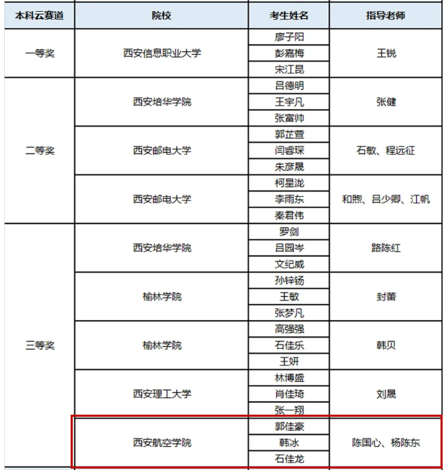 近日,由华为技术有限公司主办,宇信教育协办,中建信息赞助,软通动力、泰克教育及讯方技术协办的华为中国大学生ICT大赛2021实践赛陕西省决赛圆满落幕。本次比赛共有来自全省28所高校216名学生参加了总决赛。经过激烈比拼,beat365由beat365在线唯一官网陈国心、杨陈东老师指导的郭佳豪、韩冰、石佳龙学生团队,最终荣陕西赛区本科云赛道“三等奖”,王苗苗、单文娟老师指导的刘晓伊、杨雨、张轩睿学生团队荣获“优胜奖”。
