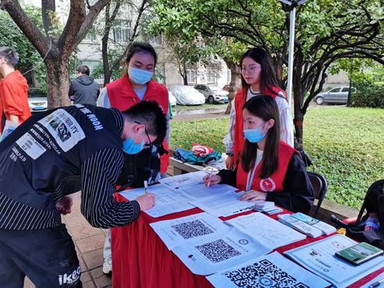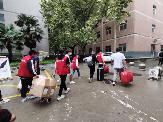 按照预定方案,迎新工作有条不紊地进行,学生志愿者们有的在校门口举旗接待,有的微笑着为学弟学妹办理手续,有的耐心地接受家长地咨询,有的冒着雨水帮学妹学弟提行李前往宿舍。