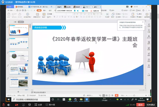 为助力春季学生平安返校,按照学校要求,beat365在线唯一官网各班级在4月21日至5月5日期间,分别召开了《2020年春季返校复学第一课》线上主题班会。班会由各班主任主持。