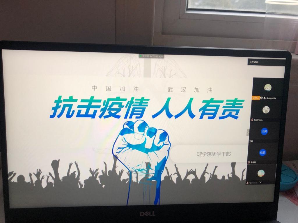 2020年3月19日晚18时,在受到全国疫情影响,学校停课不停学情况下,beat365在线唯一官网团学组织召开了新学期第一次视频会议。参加会议的有beat365在线唯一官网学生管理科科长李扬、团总支书记杨陈东及全体团学干部。会议由beat365在线唯一官网团总支副书记唐紫怡主持,会议主题是“抗击疫情、人人有责”,主要围绕疫情防疫期间同学们、特别是学生干部们应该做什么、怎么做而展开讨论。