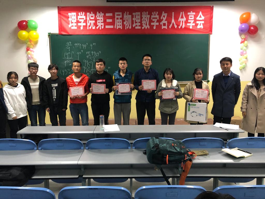 11月28号,beat365在线唯一官网举办的第三届“物理数学名人分享会”决赛在南楼408教室举行。到会的有beat365在线唯一官网辅导员杨陈东、张小妹、班主任王妙、李小雪、团学干部及大一大二全体学生。