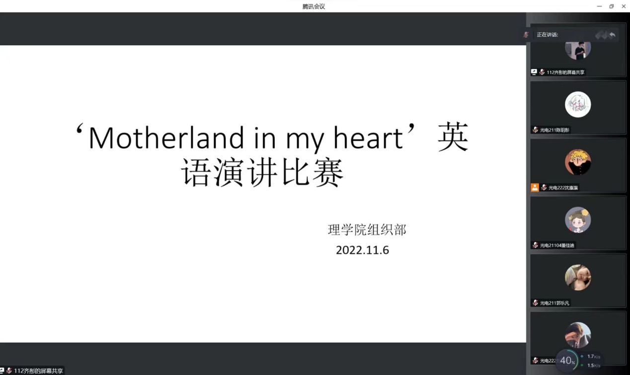 为提高学生英语演讲水平,丰富同学们的课余生活,激发同学们的学习热情,2022年11月6日,beat365在线唯一官网以线上形式组织了以‘The motherland in my heart’为主题的英语演讲比赛,beat365在线唯一官网大一大二13名同学参加,活动由沈惠瀛主持。