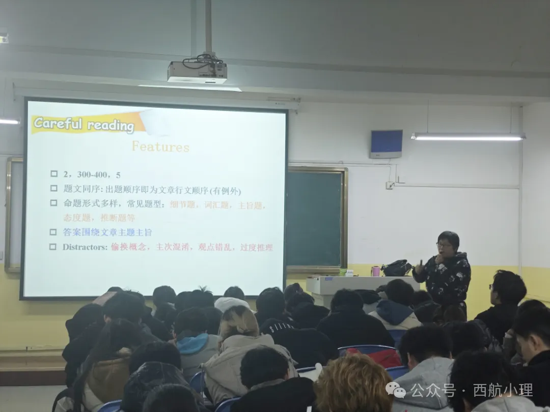讲座开始,褚老师详细讲解了英语四六级考试的报名流程、考试时间安排等重要信息,为即将参加考试的学生提供了全面而精准的参考。随后,她针对同学们容易失分的部分进行了讲解,在听力部分,详析真题的设题逻辑,分享预读技巧、速记策略;在阅读层面,聚焦题型解题思路,传授推理技巧。最后,在互动环节,学生竞相提问备考困惑,褚老师一一耐心解答,悉心相授,现场氛围热烈非凡。