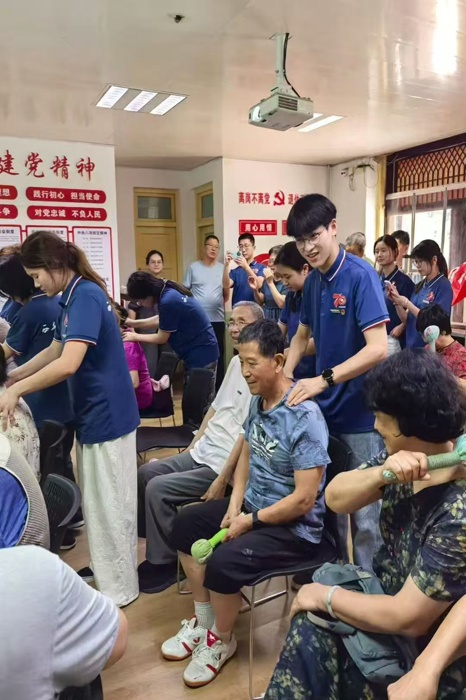 知识宣讲后,活动进入互动实践环节。在雒同学的示范和指导下,老教师们兴致盎然地学习自主按摩手法。实践队员们则化身“健康小助手”,一对一地辅助老教师们掌握要领,并运用所学技能,轻柔地为老教师们进行肩颈放松按摩,缓解日常疲劳。现场气氛温馨融洽,老教师们切实感受到来自后辈的关怀与温暖。随后,在舒缓音乐的陪伴下,闫同学和程同学带领队员与老教师们一同习练传统养生功法八段锦。一招一式,不仅弘扬了中华优秀养生文化,也有助于老教师们舒展筋骨、调和气血,现场暖意融融。