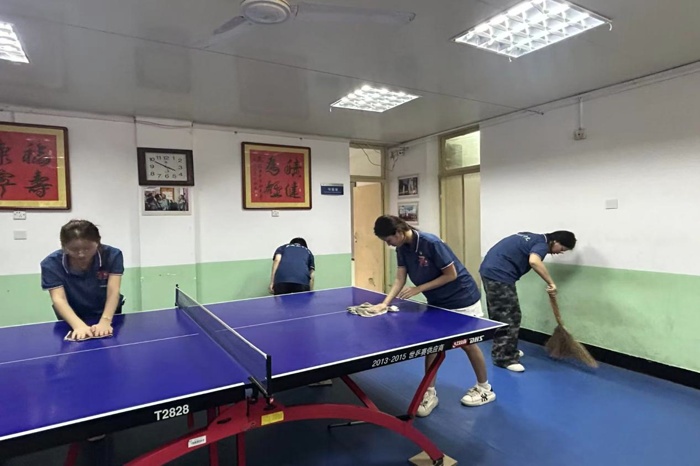 健康活动余韵未消,实践队员们服务的热忱更炽。他们随即拿起扫帚抹布,主动投入清扫。转眼间,乒乓球台光可鉴人,棋牌室桌椅井然有序,窗明几净的办公室映出队员们忙碌的身影与灿烂阳光。闷热空气里,汗水浸湿衣衫,却无人言倦。望着焕然一新的活动场地,想象老教师未来在此更舒适地相聚交流,队员们脸上漾满欣慰。 “孩子们真麻利!” 路过的老教师由衷赞叹。这方用汗水换来的洁净天地,正是学子们献给老教师的又一份“舒心家园”心意。
