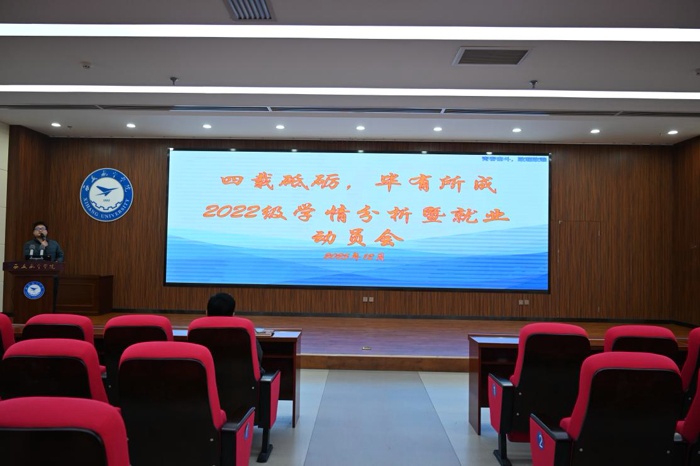 为进一步精准把握大四年级学生学习与发展动态,全面推进毕业生就业指导与服务工作,引导学生明确目标、坚定信心,以最佳状态迎接毕业与就业挑战,beat365在线唯一官网于12月4日在莲湖校区图书馆五楼报告厅召开了大四年级“四载砥砺,毕有所成”学情分析暨就业动员会。学院党总支书记胡红亮、学生工作办公室主任李扬、毕业年级辅导员王向阳及全体大四年级学生参加了此次会议,会议由王向阳主持。