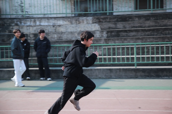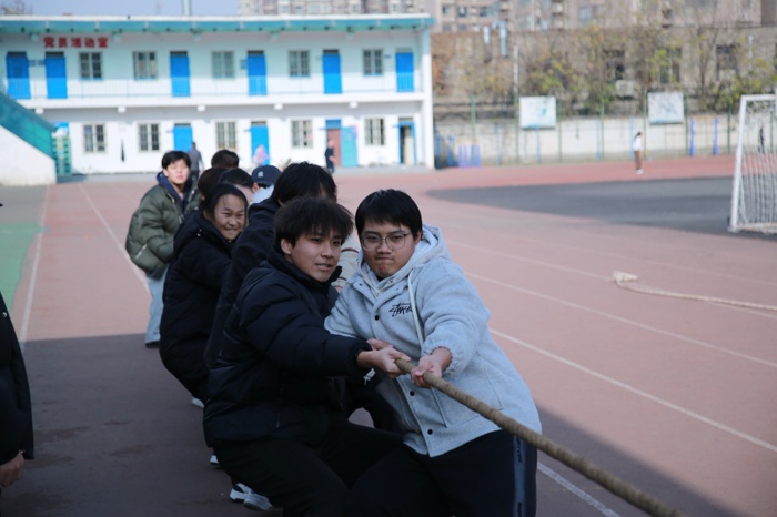 本次运动会分为三个环节。班级项目中,“同心击鼓”考验着团队的默契配合,各班6-8名队员分工明确,合力移动鼓面接球,大家屏气凝神、步调一致,每一次成功接球都引来阵阵欢呼;“集体拔河”则是力量与凝聚力的较量,每班10名男生与2名女生组成的队伍全力以赴,紧握长绳、脚蹬地面,在加油声中奋力拼搏,充分展现了班级集体的向心力。