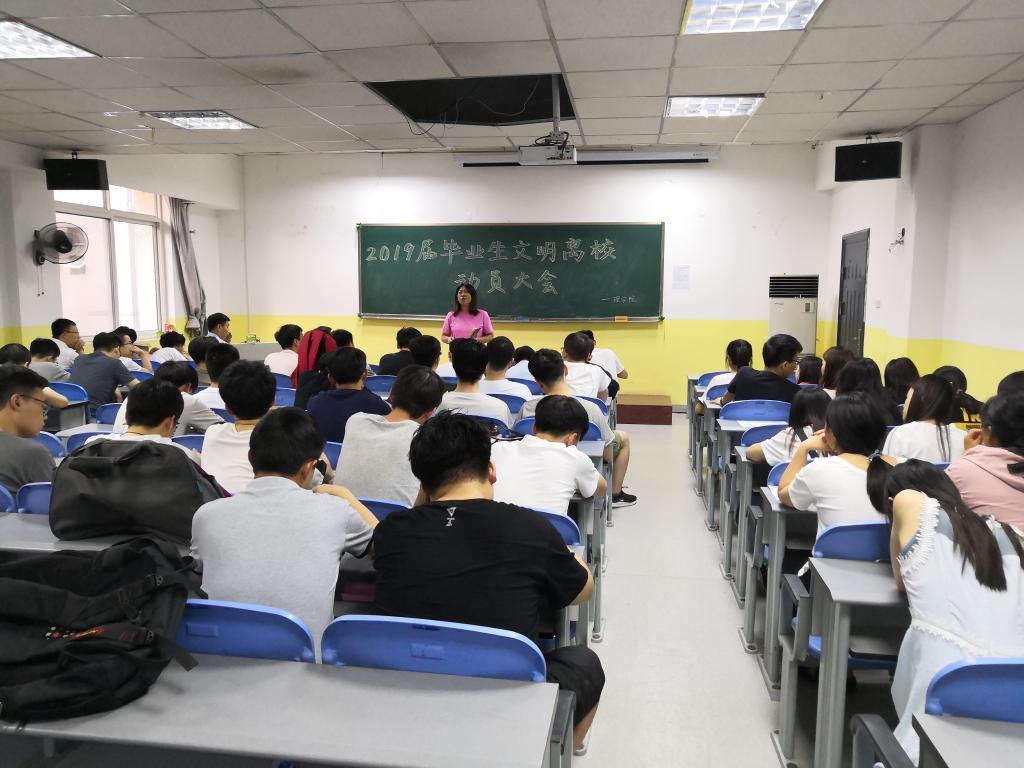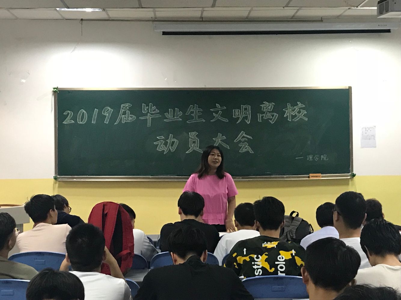 为提高毕业生文明离校意识,做好毕业生文明离校工作,6月13日19点30分,beat365在线唯一官网在南楼408教室召开了2019届毕业生文明离校动员大会。beat365在线唯一官网党总支书记李小光、学生管理科科长李扬、辅导员杨陈东和全体2019届毕业生参加了会议。会议由李扬主持。