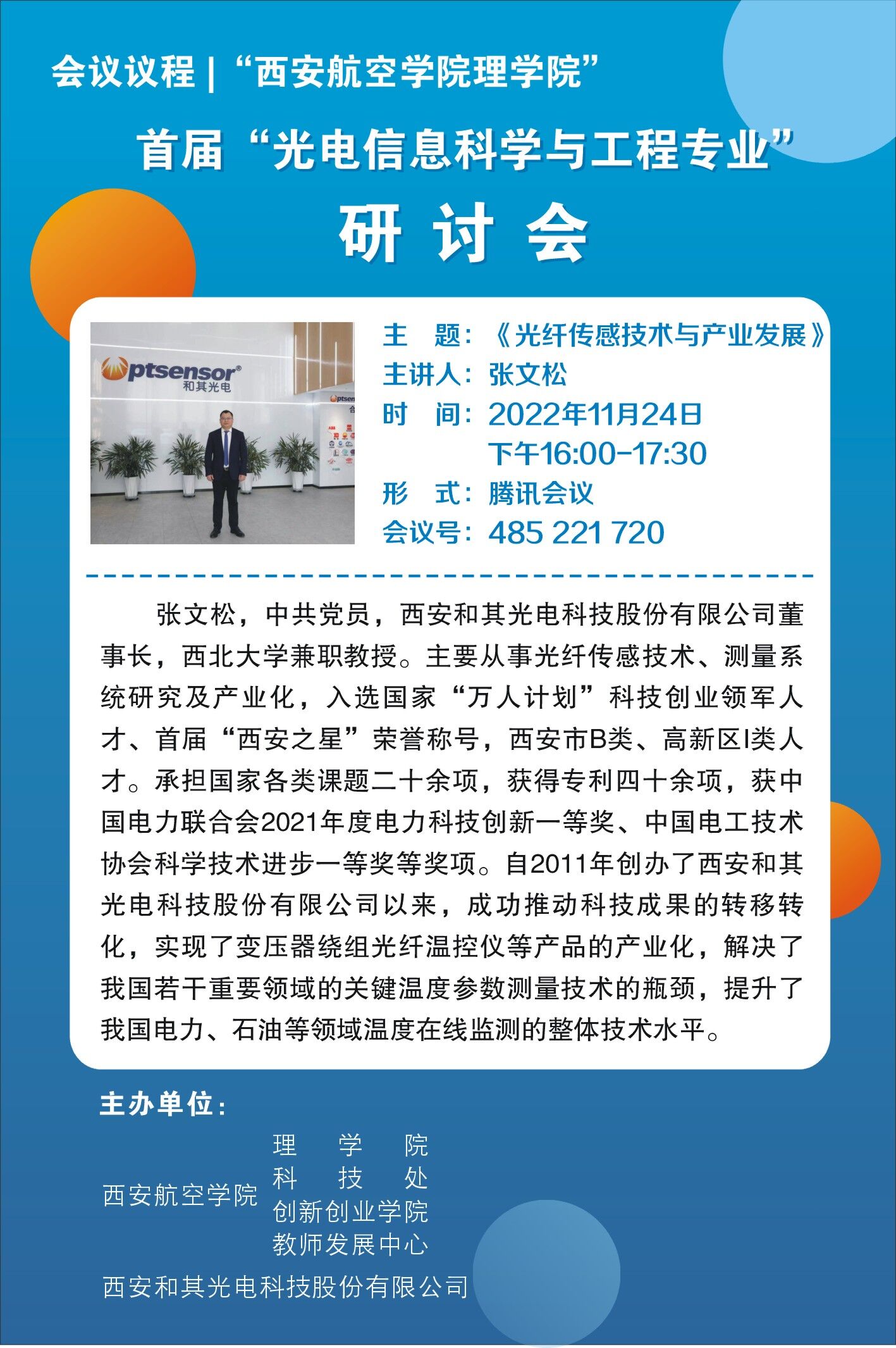 张文松简介:中共党员,西安和其光电科技股份有限公司董事长,西北大学兼职教授。主要从事光纤传感技术、测量系统研究及产业化,入选国家“万人计划”科技创业领军人才、首届“西安之星”荣誉称号,西安市B类、高新区I类人才。承担国家各类课题二十余项,获得专利四十余项,获中国电力联合会2021年度电力科技创新一等奖、中国电工技术协会科学技术进步一等奖等奖项。自2011年创办了西安和其光电科技股份有限公司以来,成功推动科技成果的转移转化,实现了变压器绕组光纤温控仪等产品的产业化,解决了我国若干重要领域的关键温度参数测量技术的瓶颈,提升了我国电力、石油等领域温度在线监测的整体技术水平。